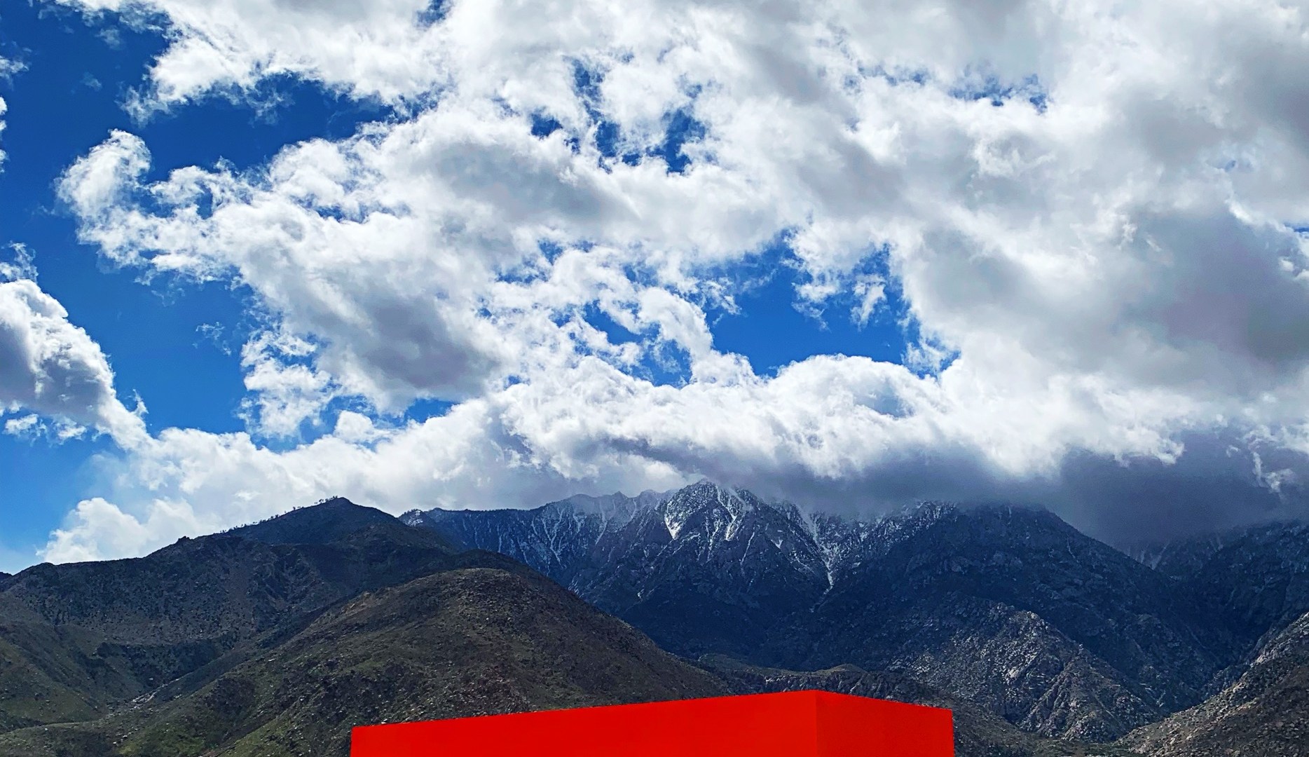 Sterling Ruby’s fluorescent orange monolith, SPECTER, appears as an apparition in the desert. The bright, geometric sculpture creates a jarring optical illusion, resembling a Photoshopped composite or collage, as if something has been removed or erased from the landscape. The block acts as a cipher or stand-in, mimicking the form it could be — a shipping container, a military bunker, an unidentified object, an abandoned home-stead. Fluorescent orange is traditionally used for safety, as a warning. Here that logic is reversed: a ghostly object, set apart from the natural environment, hiding in plain sight.