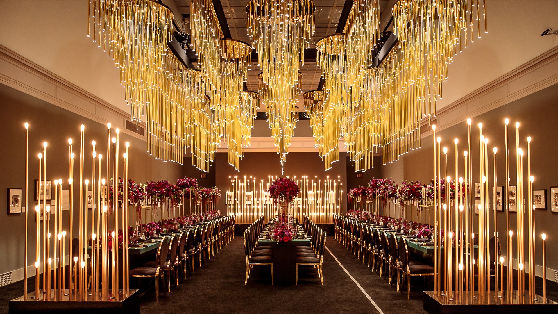 Matter being escorted upstairs, guest entered the dining gallery through a tunnel of lights into a room with a custom full overhead installation ceiling of over 40 gold Art Deco chandeliers with areas of complementary floor chandeliers reaching upwards. Similarity the jewel toned floral centerpieces reached upwards on gold risers off the emerald velvet table linen. Colored crystal and gold place settings brought it all together.