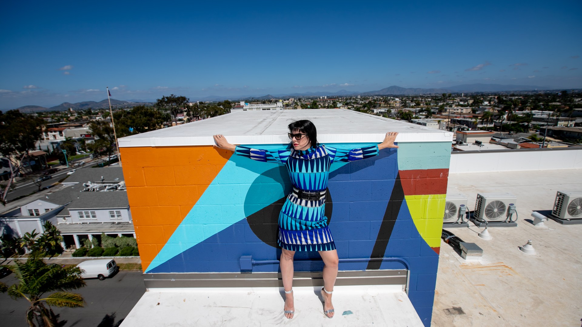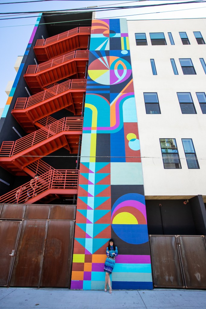 When I heard a 68 foot tall double mural was going in on a new apartment building in North Park I was immediately obsessed with creating a shoot. Hannah’s Murals is run by local artist Hannah who in my opinion has one the most expansive and diverse mural portfolios in town. She good at everything! Figurative work, impressionistic work, and as you will see here, she’s a whiz at geometric fractal art as well! When I saw from her page that the 6 story mural went up and also wrapped around the features on the roof, I was enraptured with this unique location.