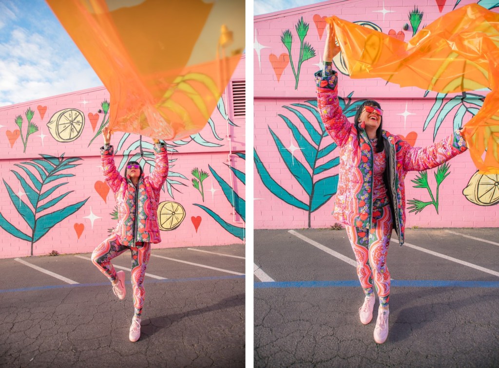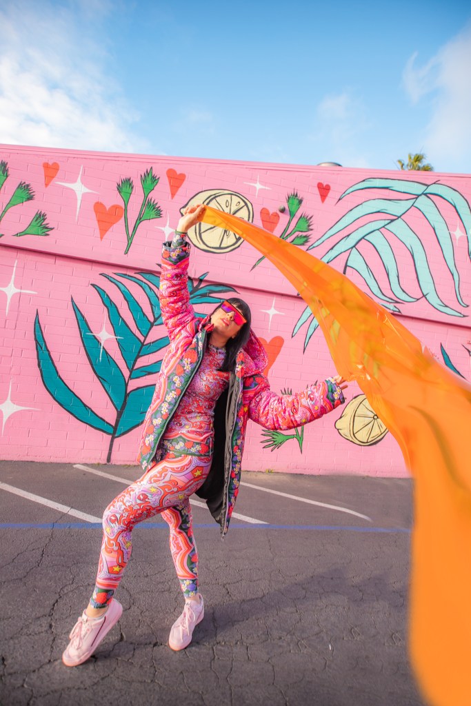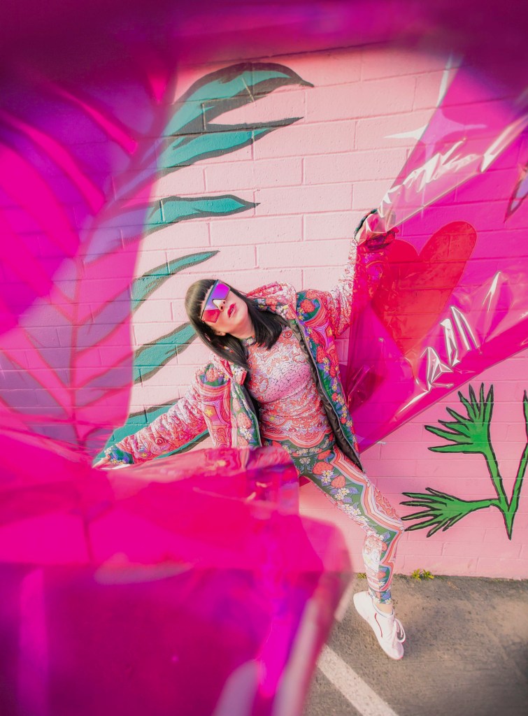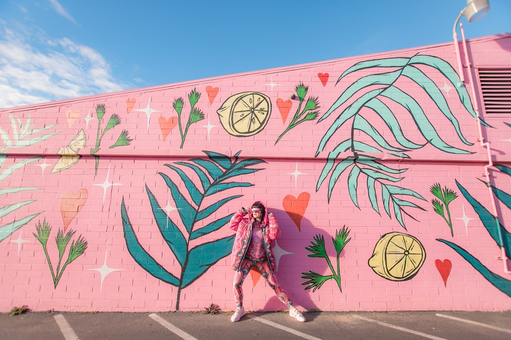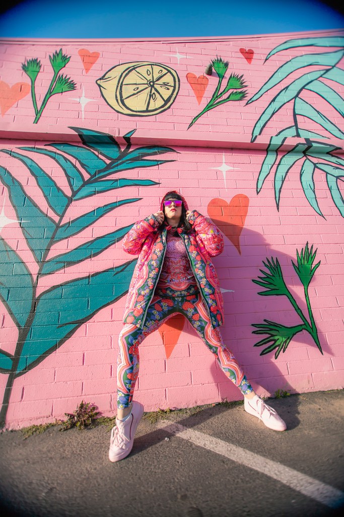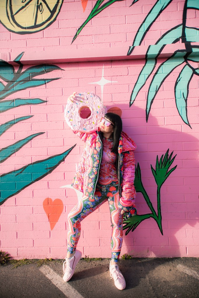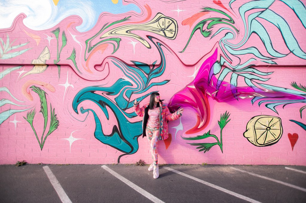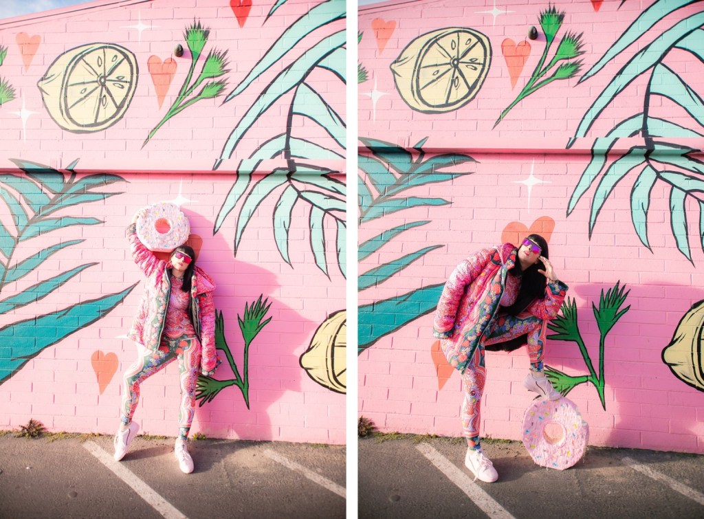 Dopamine is an important brain chemical that influences your mood and feelings of reward and motivation. Dopamine Dressing is putting on clothes in such a way that it actually lifts your mood and gives you an overwhelming sense of happiness. Whether you can actually dress yourself happy is a much debated subject, but I have experienced it firsthand and I have done this for a long time without actually having the terminology. Maybe we aren’t all wired this way, but what I’m wearing has always given me my emotional armor for the day. If I need a little lighthearted positivity I’ll throw on something with a lot of bright color and a little whimsy…or if I need to take on a particularly hard day and feel like a BOSS I’ll put something on with hard edges or something in darker tones with a hint of subtle sexiness. When I feel like I am accurately represented my mood with fashion I feel like I can actually change the mood of others around me also. I use this method when shopping and picking partnerships as well. My blog is all about delivering inspiration or happiness through art, color and fashion and I really like to work with others who have a similar outlook. I can honestly tell you I had an instant rush of dopamine the minute I came across the work of Jordan Piantedosi. She is an interdisciplinary artist who uses her artwork in the creation of, as she calls them, “bizarre textiles” to use in what I find to be the most joyful pieces I have come across in a long while. I was instantly drawn to this effervescent print with strawberries, brains, teeth and a hefty dose of pink and putting this ensemble on is the definition of dopamine dressing. Anywhere I wear this people stop me to comment on how happy it makes them which makes me feel like a walking piece of art. Angela from Create with Gusto and I paired it with this equally happiness-infused mural by local muralist Panca and it was really a match made in heaven the gets all the joy juices flowing.