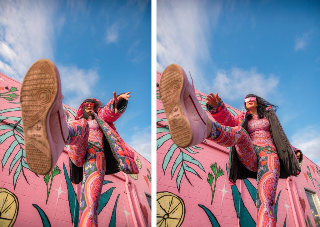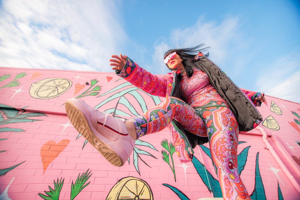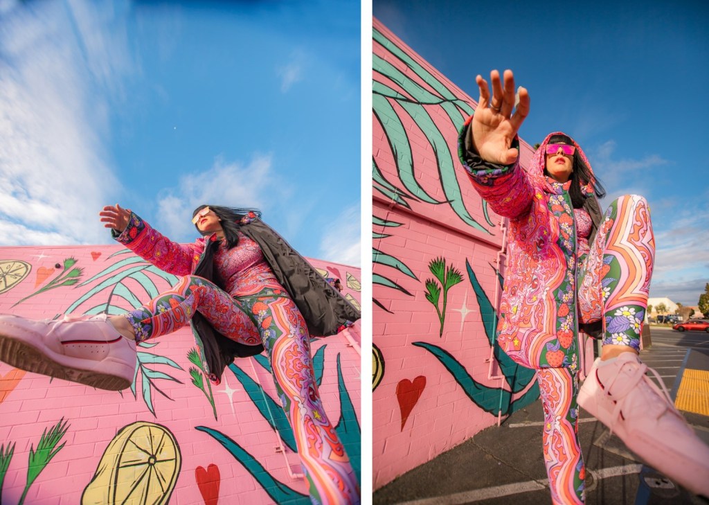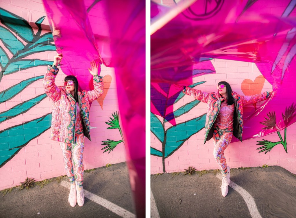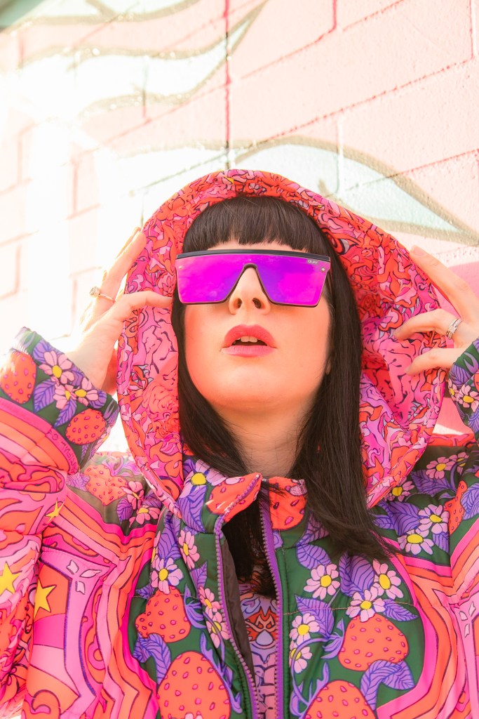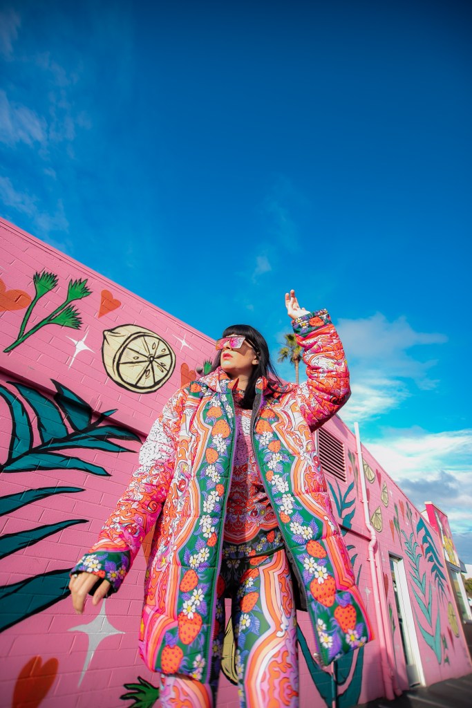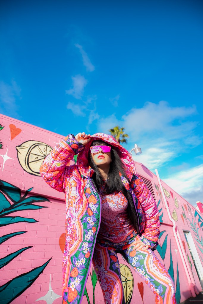 Dopamine is an important brain chemical that influences your mood and feelings of reward and motivation. Dopamine Dressing is putting on clothes in such a way that it actually lifts your mood and gives you an overwhelming sense of happiness. Whether you can actually dress yourself happy is a much debated subject, but I have experienced it firsthand and I have done this for a long time without actually having the terminology. Maybe we aren’t all wired this way, but what I’m wearing has always given me my emotional armor for the day. If I need a little lighthearted positivity I’ll throw on something with a lot of bright color and a little whimsy…or if I need to take on a particularly hard day and feel like a BOSS I’ll put something on with hard edges or something in darker tones with a hint of subtle sexiness. When I feel like I am accurately represented my mood with fashion I feel like I can actually change the mood of others around me also. I use this method when shopping and picking partnerships as well. My blog is all about delivering inspiration or happiness through art, color and fashion and I really like to work with others who have a similar outlook. I can honestly tell you I had an instant rush of dopamine the minute I came across the work of Jordan Piantedosi. She is an interdisciplinary artist who uses her artwork in the creation of, as she calls them, “bizarre textiles” to use in what I find to be the most joyful pieces I have come across in a long while. I was instantly drawn to this effervescent print with strawberries, brains, teeth and a hefty dose of pink and putting this ensemble on is the definition of dopamine dressing. Anywhere I wear this people stop me to comment on how happy it makes them which makes me feel like a walking piece of art. Angela from Create with Gusto and I paired it with this equally happiness-infused mural by local muralist Panca and it was really a match made in heaven the gets all the joy juices flowing.