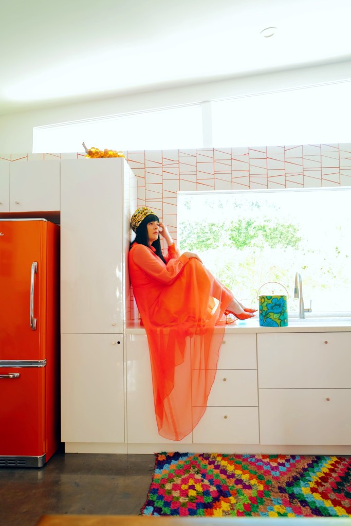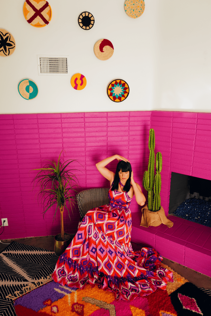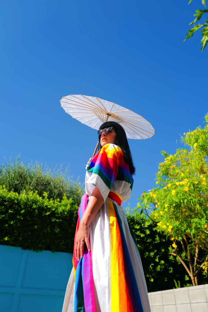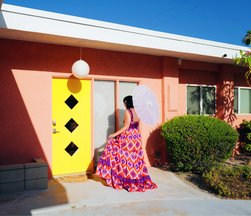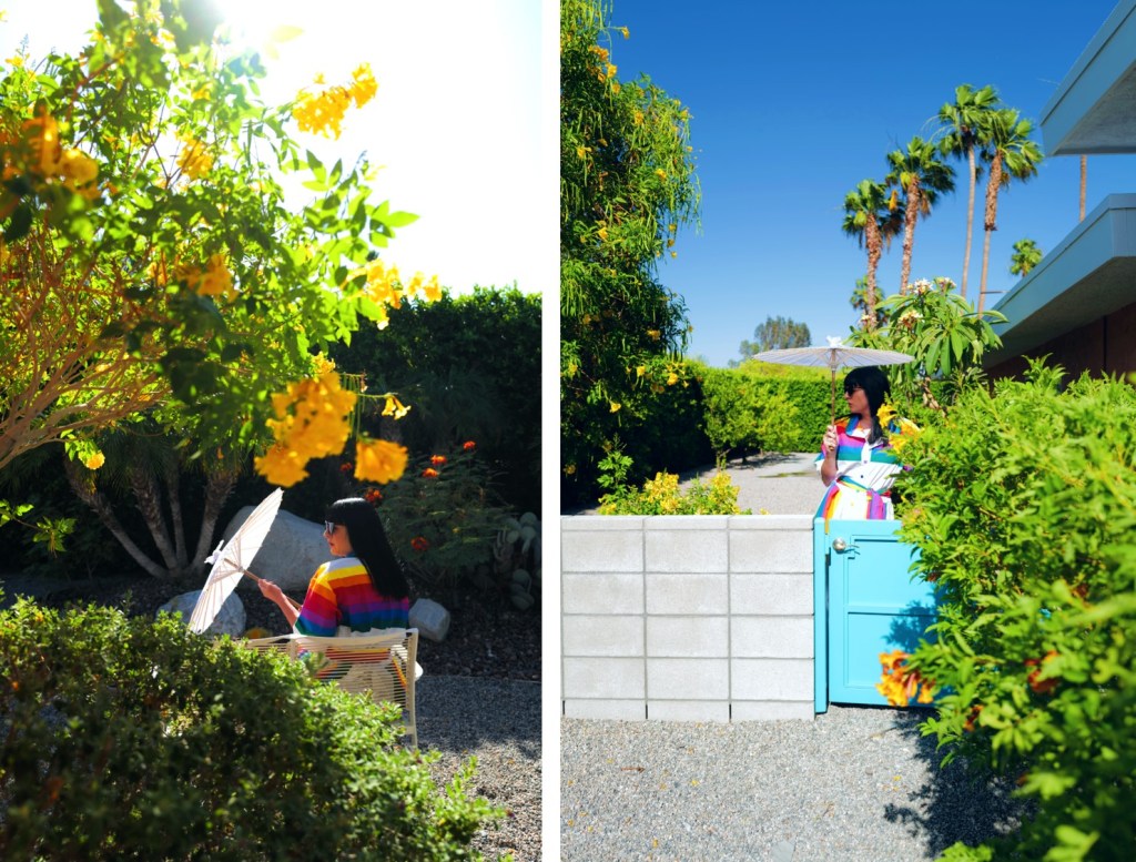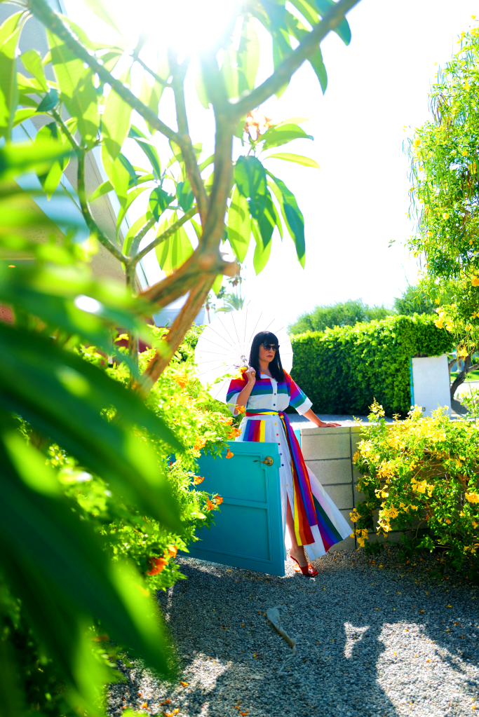 Welcome to the Rainbow Retreat…A colorful place that is so special in my second home Palm Springs. When we were planning our spring trip to PS I knew I wanted to stay in a house this time around. The seclusion and relaxation a private home offers cannot be beat, but I knew it also had to fit my vibe. I didn’t have to look any further than this quaint colorful retreat aptly named Rainbow. Originally built in 1956, it has all the classic characteristics of my favorite midcentury homes….clean lines, slanted ceilings, brickwork, and swaths of ample light. The owners have stayed true to the era but pushed it into full color glam mode which makes it lighthearted and just a bit extra…ok a lot extra. Each room has its own color scheme and personality. The kitchen was a personal favorite with the playful bright orange appliances and matching geo tile. And the main bedroom was cozy yet sexy with its provocative pink details and many lush touches. The outdoor spaces are a thoughtful entry to the indoor maximalist masterpiece with simple gravel pathways but with an abundance of colorful plants and florals and some pops of color on the gates. Its very possible to feel so comfortable and also so inspired at the same time. I called my friend and master photographer Everette (Jevpic) to shoot in this magical home space and these photos are such a mid-mod vibe! You too can stay in this very special space in my favorite desert oasis. My friends over at Rainbow Retreat are waiting for your call.