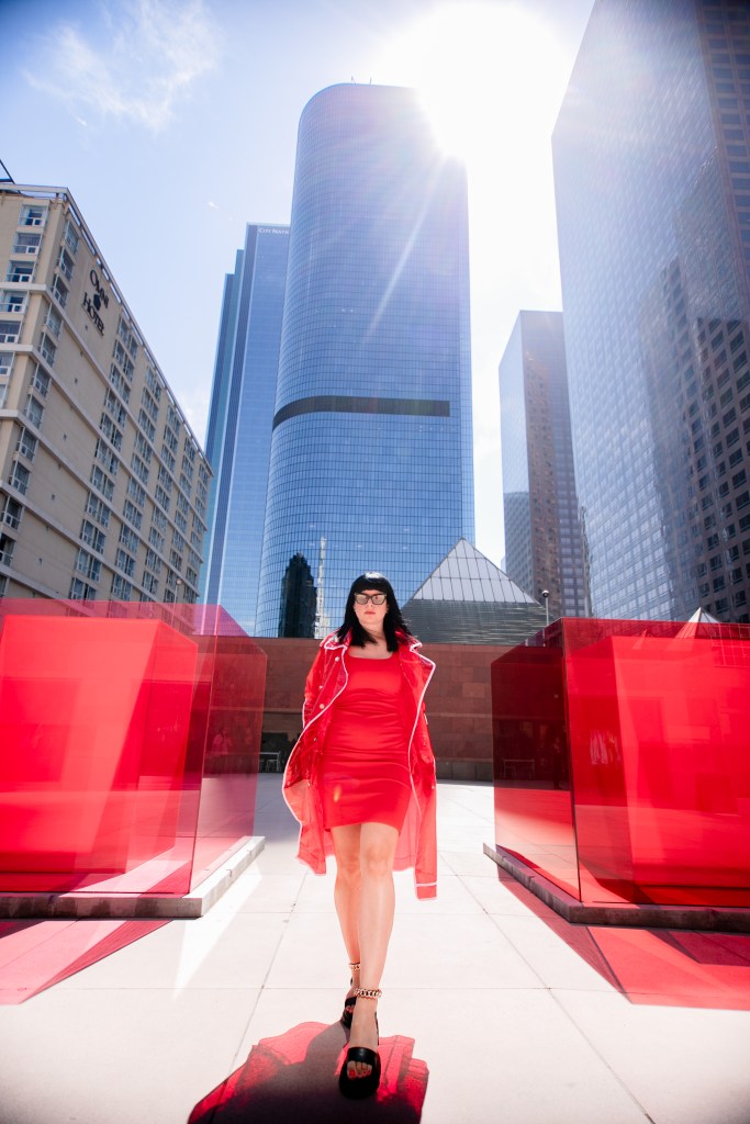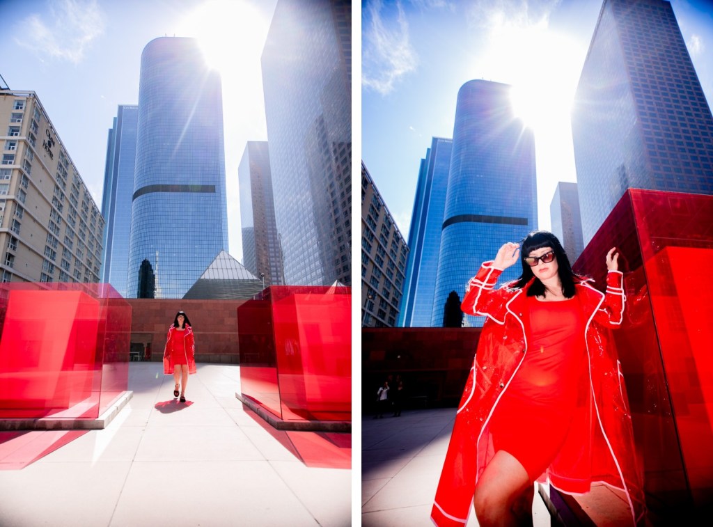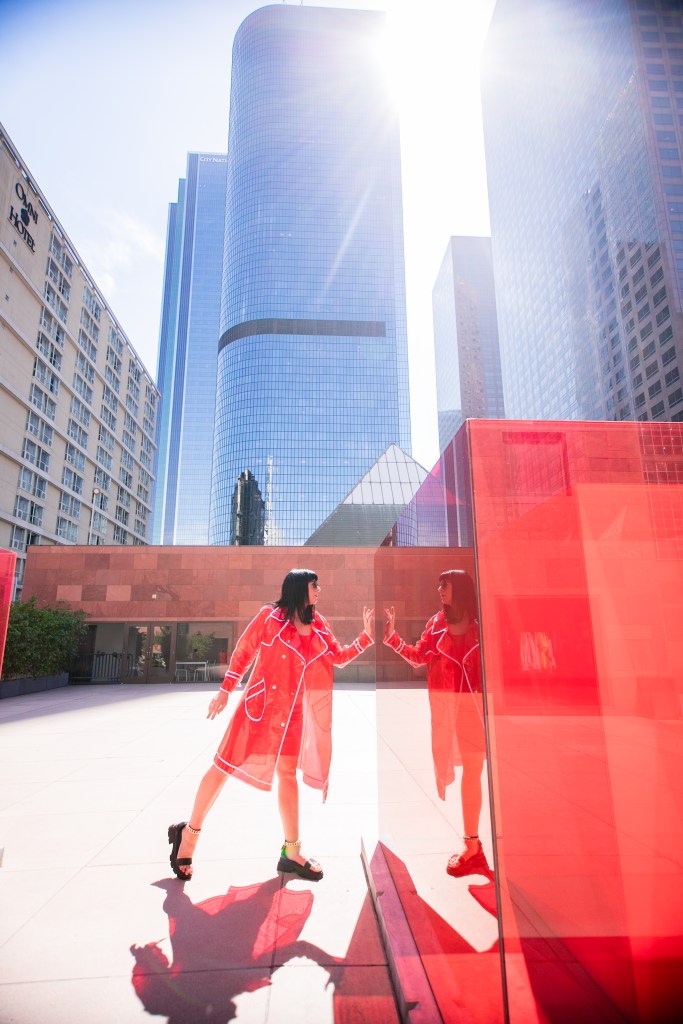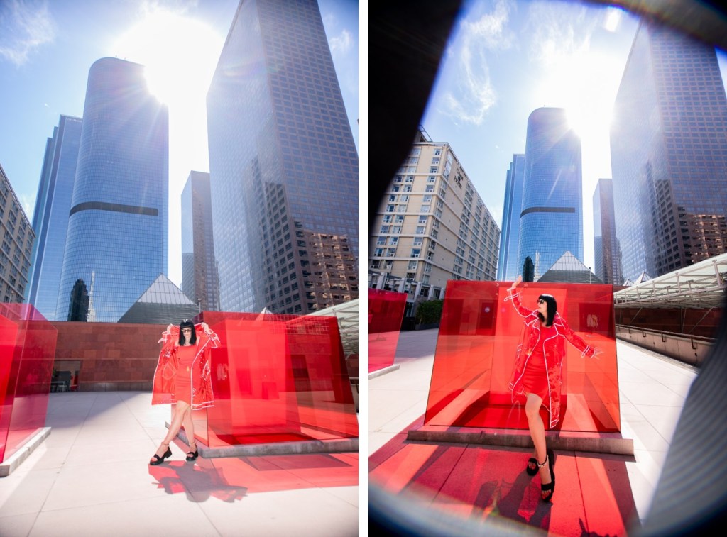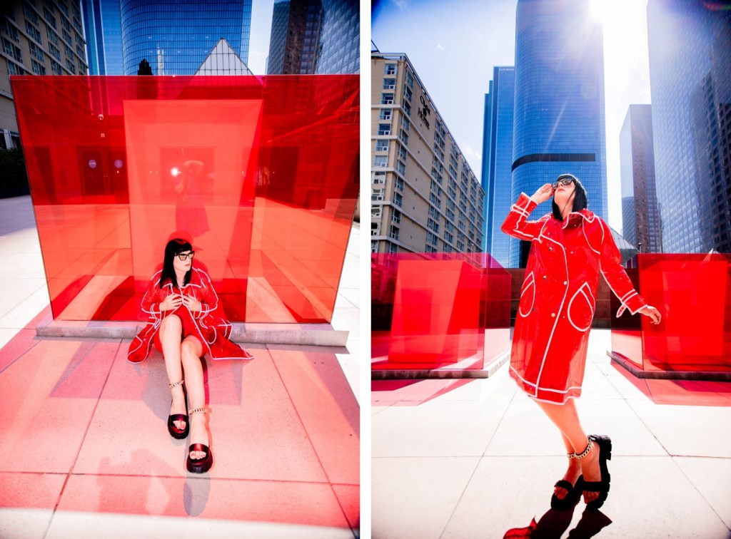 I love San Diego! The fine art and street art alike are top notch, but sometimes I just need to explore the art in a new city. This summer has luckily afforded me many opportunities to see what’s happening in the art world in several other cities. I often call these Art Adventures! It’s always easy and fun to take a quick jaunt up north to LA to take in the world-class Museum scene in LA, so a few weeks ago Angela Garzon, Stefanie Bales and I went up for a girls’ creative overnight did just that. One place I had never been but always wanted to check out was MOCA in downtown LA. Often overshadowed by its colossal neighbor, The Broad, I had not heard many reviews of this Museum. I was pleasantly surprised at the facility and impressed with collection and the abundant well-curated immersive installations. Two of the installations I was most excited to see work with light play, so armed with a sheer red vinyl coat by Domdrich, we did a photo shoot with some super high-key drama for these photo moments I’m obsessed with!