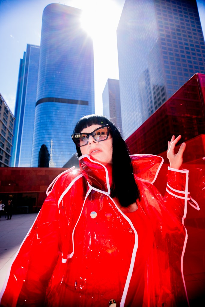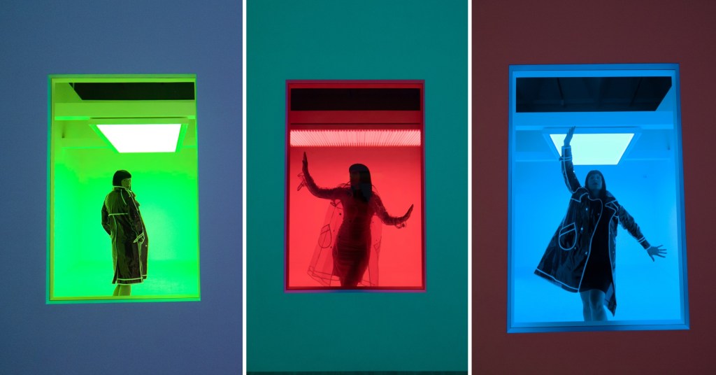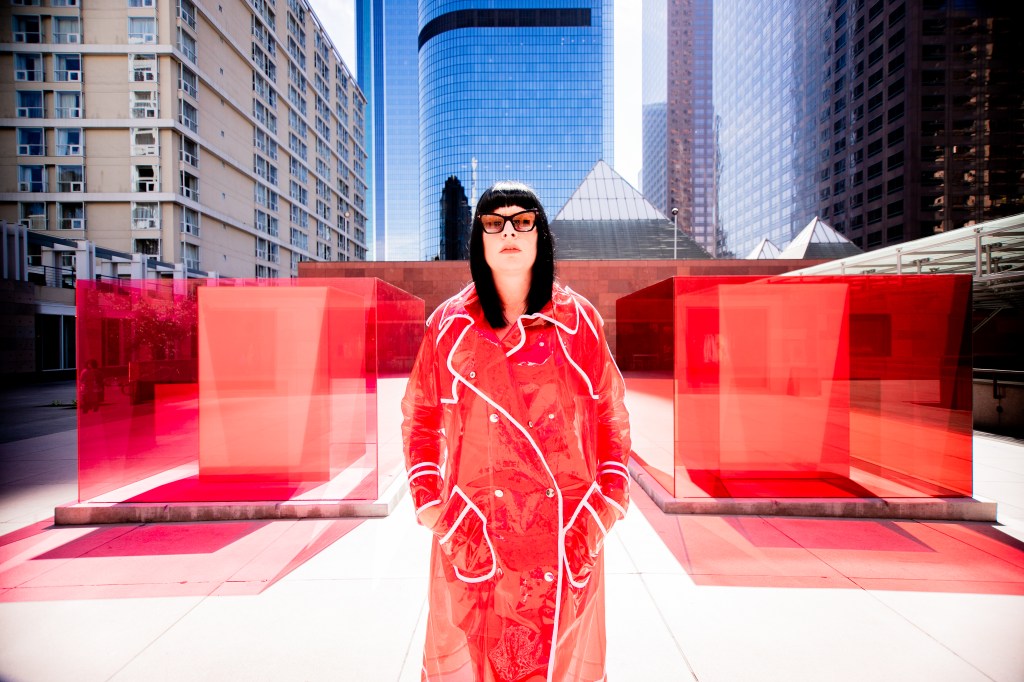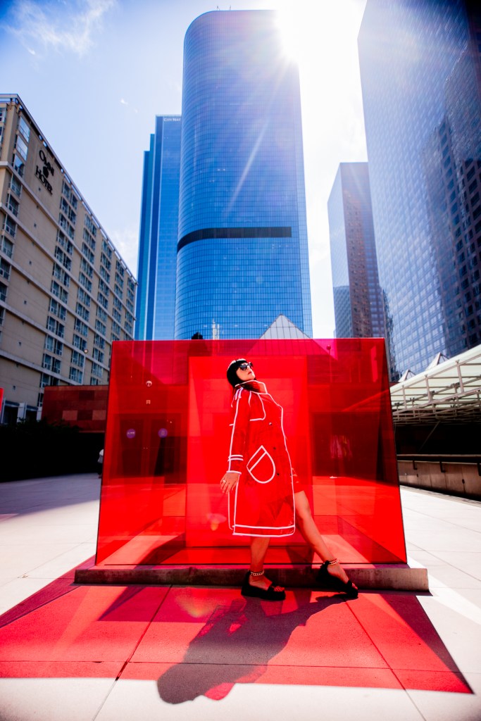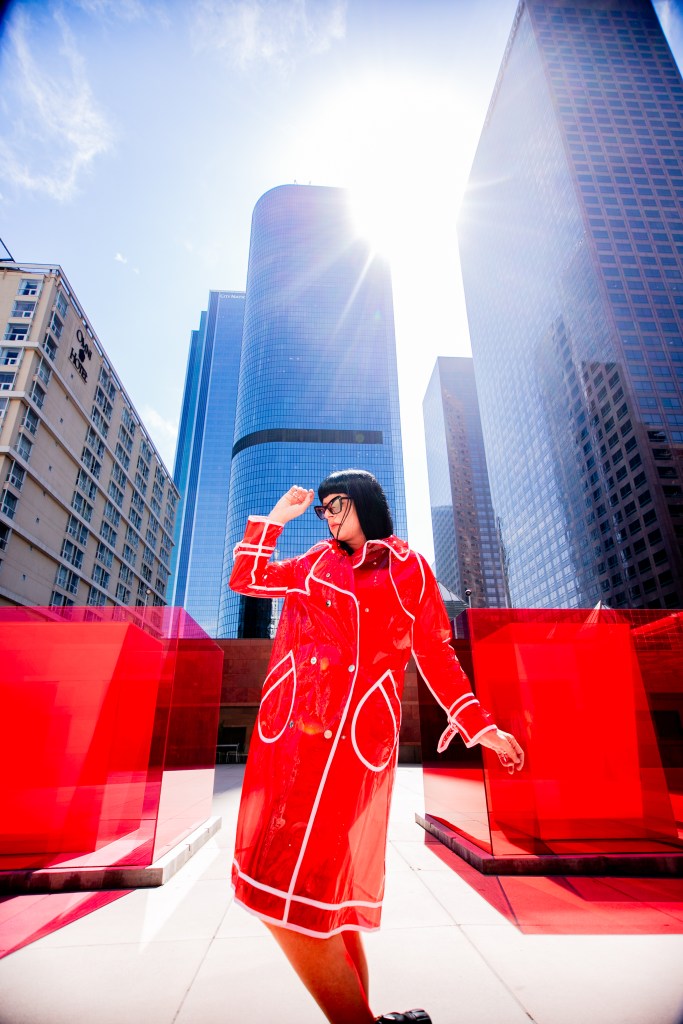I love San Diego! The fine art and street art alike are top notch, but sometimes I just need to explore the art in a new city. This summer has luckily afforded me many opportunities to see what’s happening in the art world in several other cities. I often call these Art Adventures! It’s always easy and fun to take a quick jaunt up north to LA to take in the world-class Museum scene in LA, so a few weeks ago Angela Garzon, Stefanie Bales and I went up for a girls’ creative overnight did just that. One place I had never been but always wanted to check out was MOCA in downtown LA. Often overshadowed by its colossal neighbor, The Broad, I had not heard many reviews of this Museum. I was pleasantly surprised at the facility and impressed with collection and the abundant well-curated immersive installations. Two of the installations I was most excited to see work with light play, so armed with a sheer red vinyl coat by Domdrich, we did a photo shoot with some super high-key drama for these photo moments I’m obsessed with!