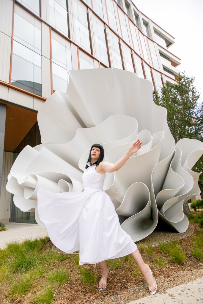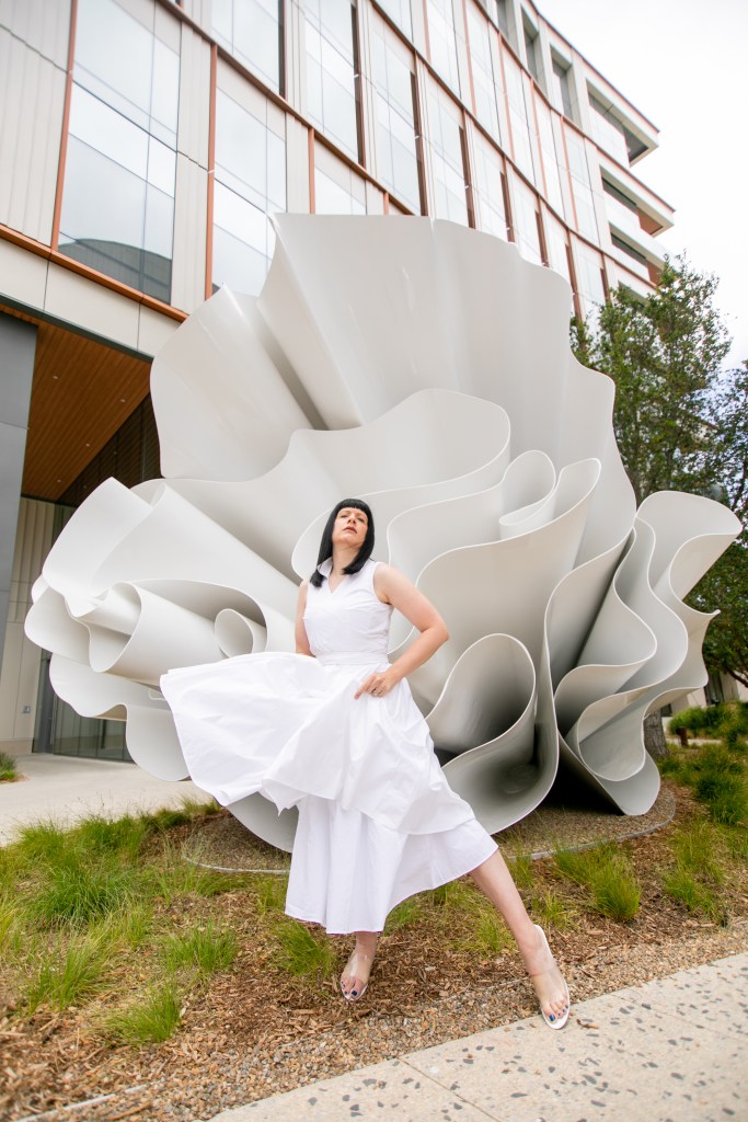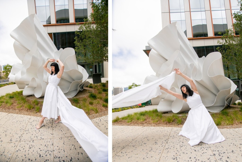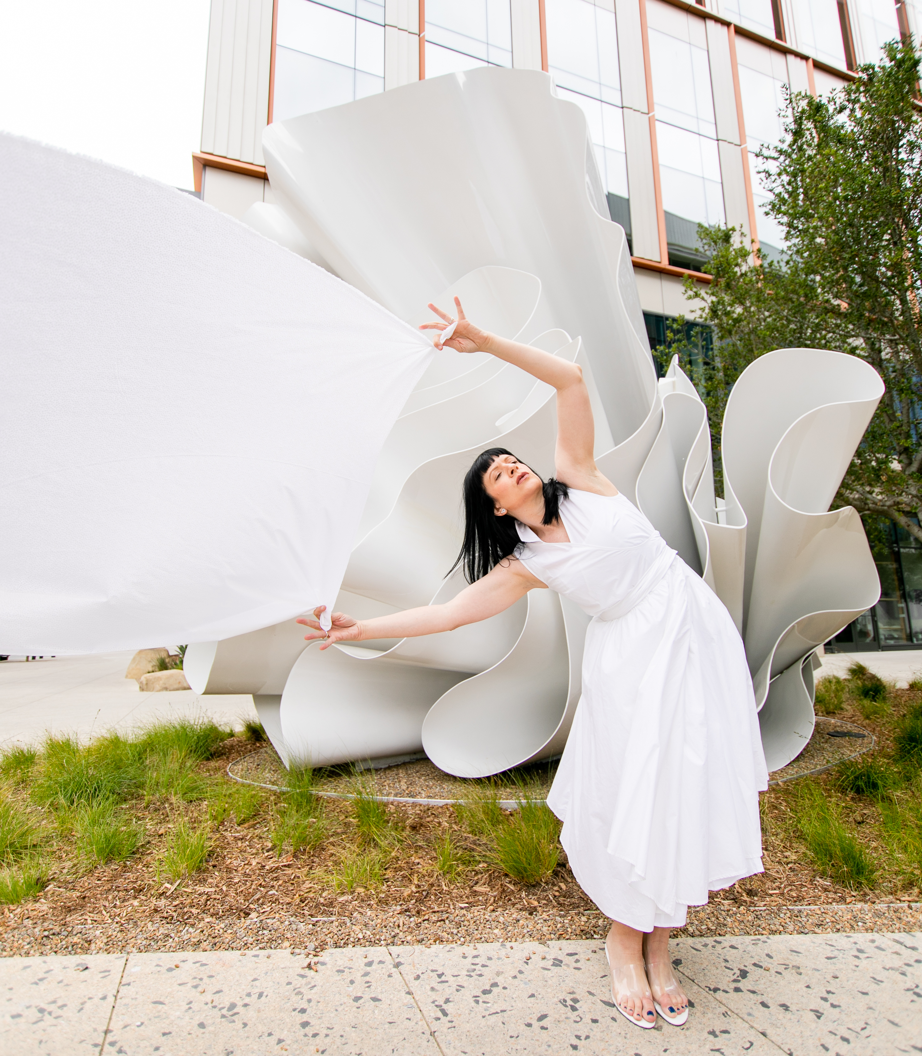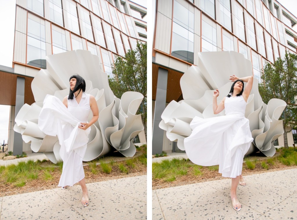 I know I’ve talked about my love for public art on this blog before. Adding murals, sculptures or installations to even the most ordinary of spaces, transforms them into places of inspiration and conversation. Public art can beautify urban landscapes, and with these pieces being accessible to everyone, they make art a part of daily life rather than only confined to Museums and galleries. So when a new project crops up in my city that brings in fresh public art, I get very very excited. Such a project has just begun to take shape here in San Diego…the new RaDD life sciences and biotech district on the San Diego Waterfront. The RaDD district is a new urban commercial project occupying 6 blocks of downtown featuring five architecturally distinct buildings, a 1.7-acre park, a pedestrian paseo, and a public art walk that will feature 18 contemporary artworks. The whole space is beautiful, but the 18 pieces of new public art is what I’m extremely excited about. The space is not 100% completed as of this post date, but some of the pieces have already become available for view. This post is #1 in a new series where I will be featuring these astounding pieces in the RaDD art walk collection. I selected a beautiful all-white fiberglass sculpture by artist Alice Aycock as the kickoff feature to this series. This piece specifically lent itself to fashion with its fabric or flower-like undulation…and I liked the challenge of making dynamic art-pairing images without the aid of the wild color I usually feature. I am excited to hear your thoughts on this new collection.