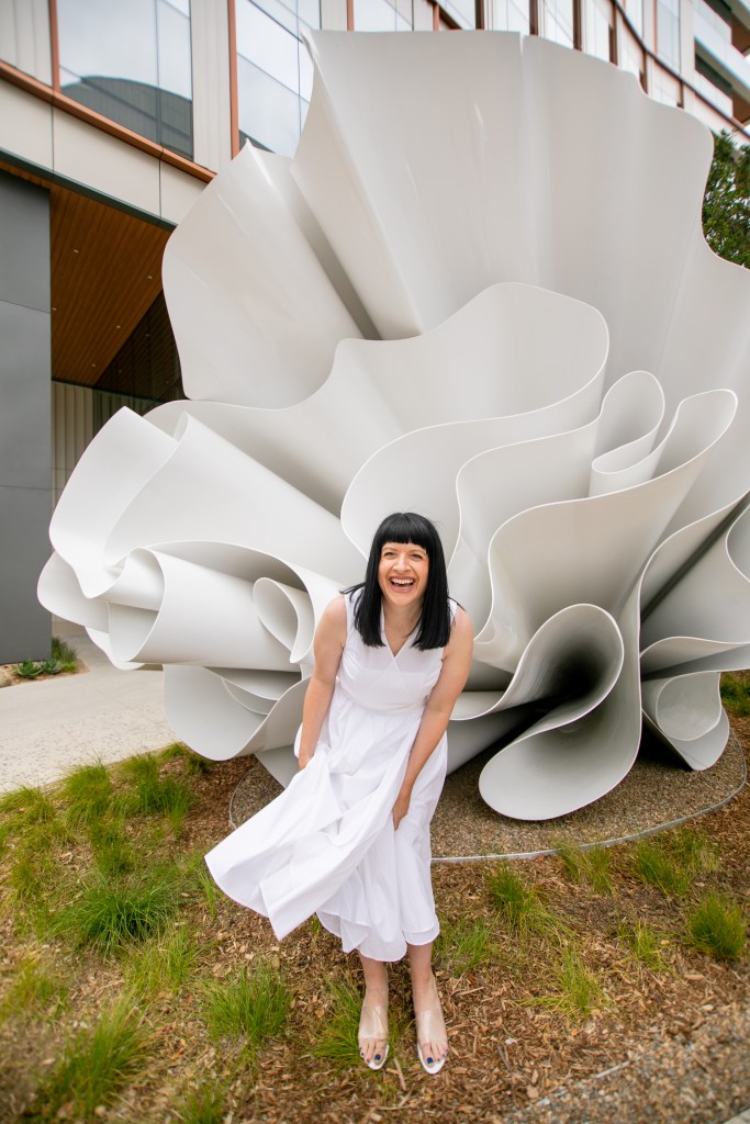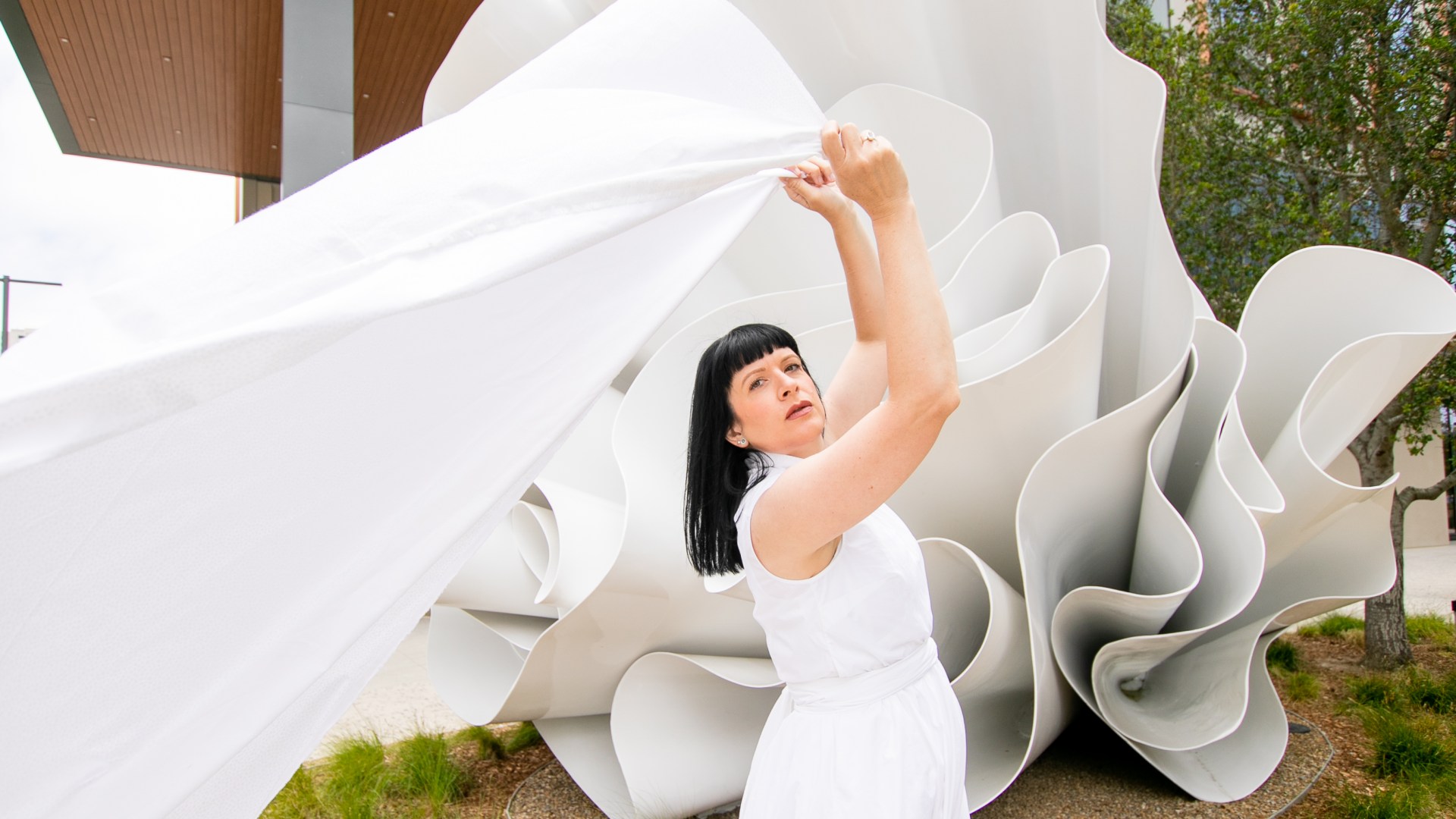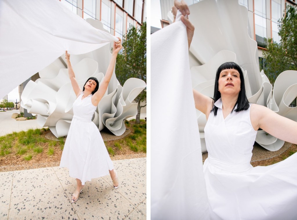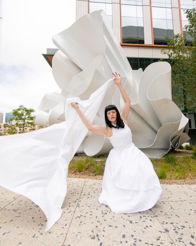 I know I’ve talked about my love for public art on this blog before. Adding murals, sculptures or installations to even the most ordinary of spaces, transforms them into places of inspiration and conversation. Public art can beautify urban landscapes, and with these pieces being accessible to everyone, they make art a part of daily life rather than only confined to Museums and galleries. So when a new project crops up in my city that brings in fresh public art, I get very very excited. Such a project has just begun to take shape here in San Diego…the new RaDD life sciences and biotech district on the San Diego Waterfront. The RaDD district is a new urban commercial project occupying 6 blocks of downtown featuring five architecturally distinct buildings, a 1.7-acre park, a pedestrian paseo, and a public art walk that will feature 18 contemporary artworks. The whole space is beautiful, but the 18 pieces of new public art is what I’m extremely excited about. The space is not 100% completed as of this post date, but some of the pieces have already become available for view. This post is #1 in a new series where I will be featuring these astounding pieces in the RaDD art walk collection. I selected a beautiful all-white fiberglass sculpture by artist Alice Aycock as the kickoff feature to this series. This piece specifically lent itself to fashion with its fabric or flower-like undulation…and I liked the challenge of making dynamic art-pairing images without the aid of the wild color I usually feature. I am excited to hear your thoughts on this new collection.