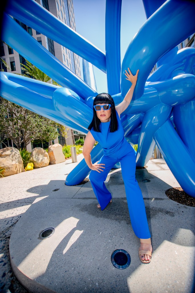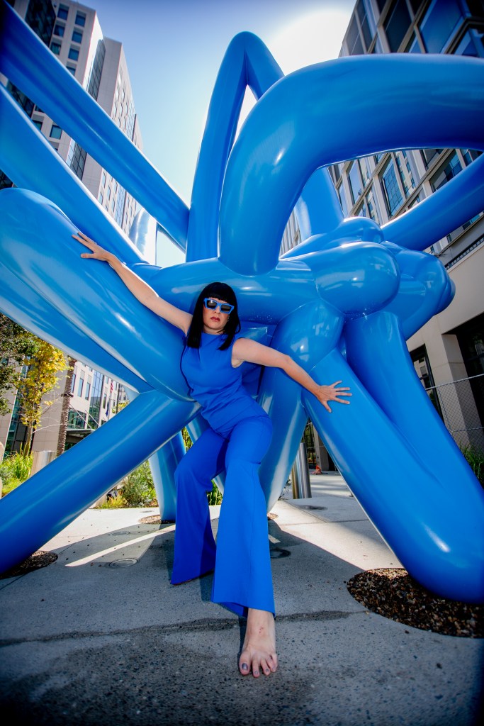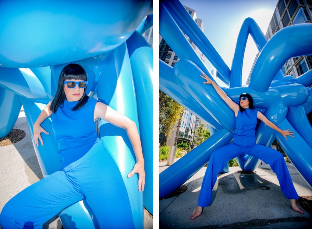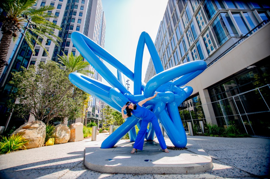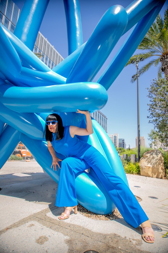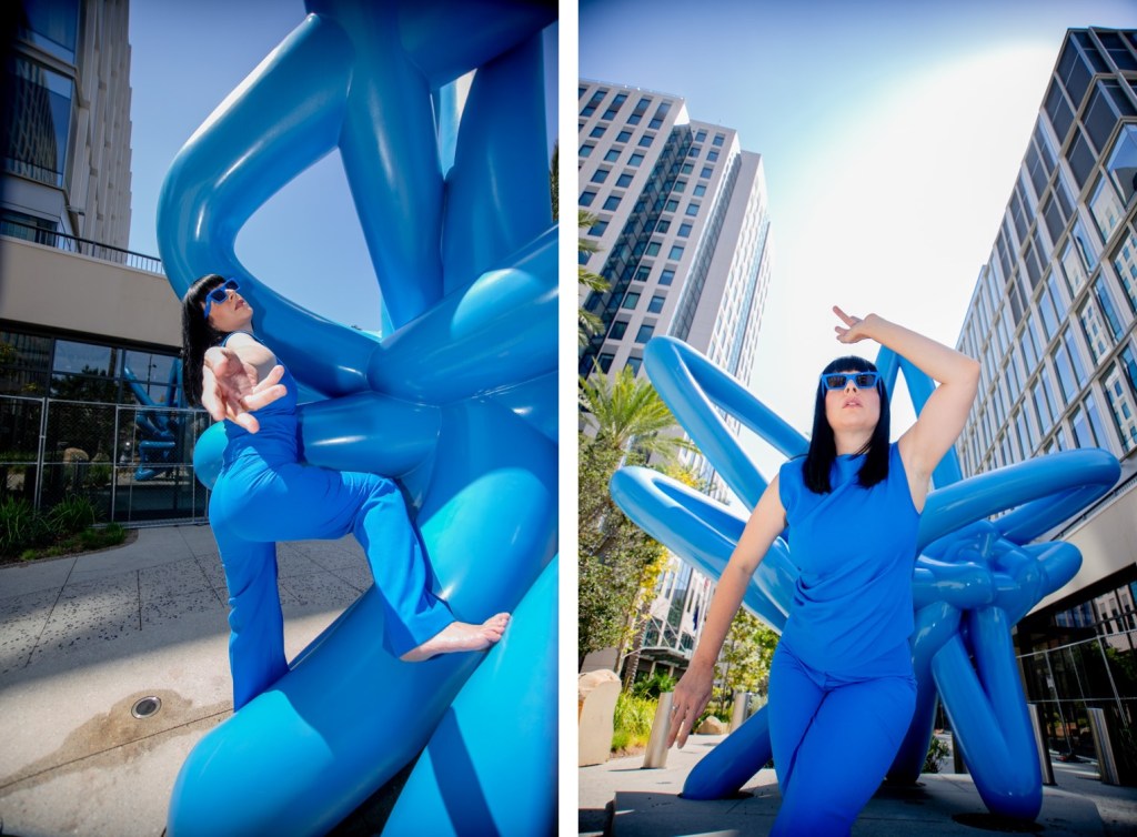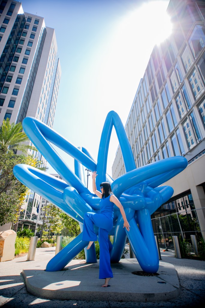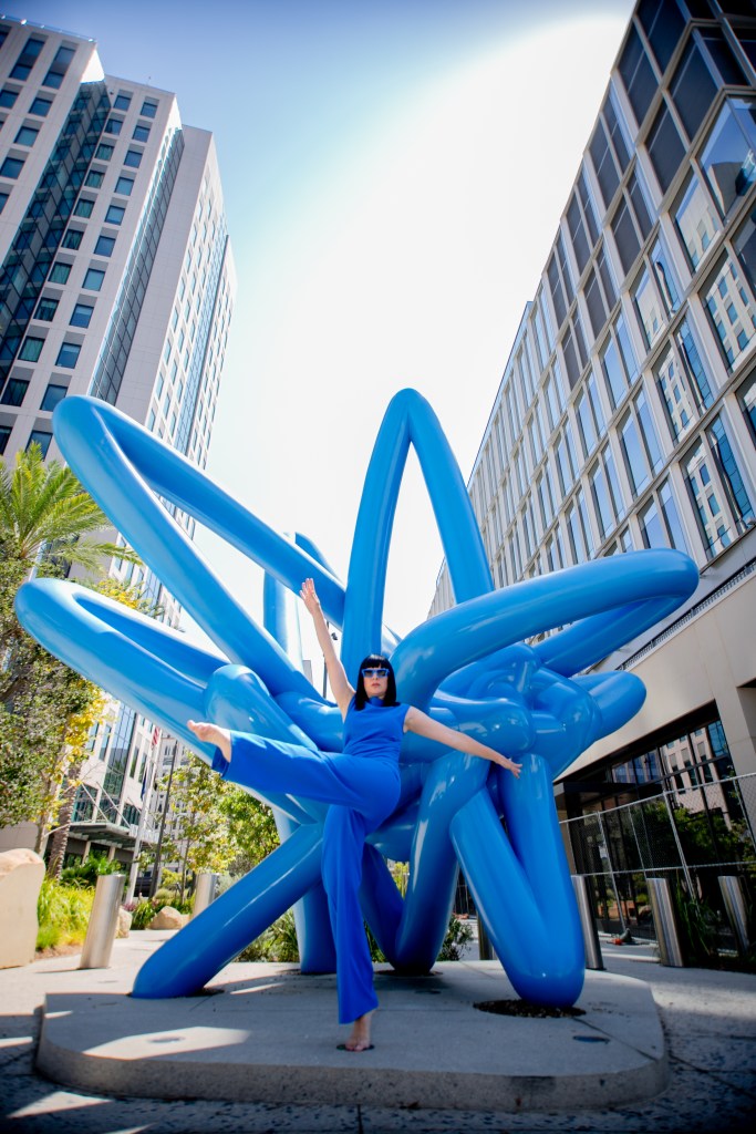 I am super excited to post my second blog feature covering another piece from the new RaDD Artwalk near the San Diego Waterfront. Since my last post, RaDD has created a dedicated website for the Artwalk where you can learn about all 19 pieces featured in this free public walk. (Site: RaDD Artwalk). For my second blog feature of this collection, I chose another one of the sculptures that really inspired me. The piece is Hand Drawn Sculpture by artist Ken Kelleher. As a color lover, the unique blue immediately caught my attention, however when I read more about the piece I was even further intrigued by its inception. According to the artist’s own description, “Hand Drawn Sculpture blurs the lines between two and three-dimensional art forms by merging the fluid, gestural lines of drawing with the tangible presence of sculpture. Crafted from interlocking steel, the dynamic and abstract composition creates a playful exploration of the relationship between these mediums.” Turning a 2-dimensional scribble or sketch into 3-dimenstional monumental piece is brilliant in its simplicity. The gestural feel of this sculpture made me think of stretching and dance so my goal for this shoot was to simply join in on its joyful movement. Finding an outfit in the exact color blue that would also give me freedom of movement was challenging, but I feel the final result is as perfect a match as it could get. I’m energized by this infusion of art into San Diego’s downtown area and I am excited to continue to feature these dynamic works.