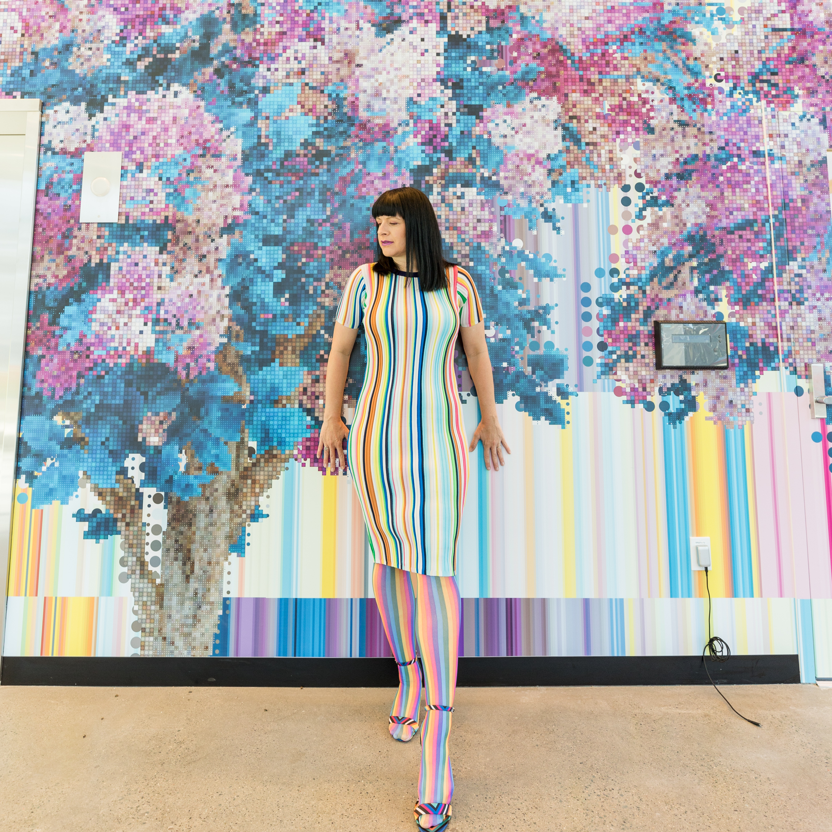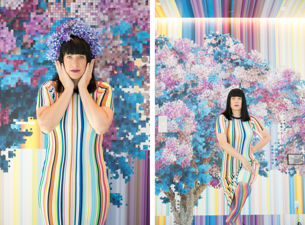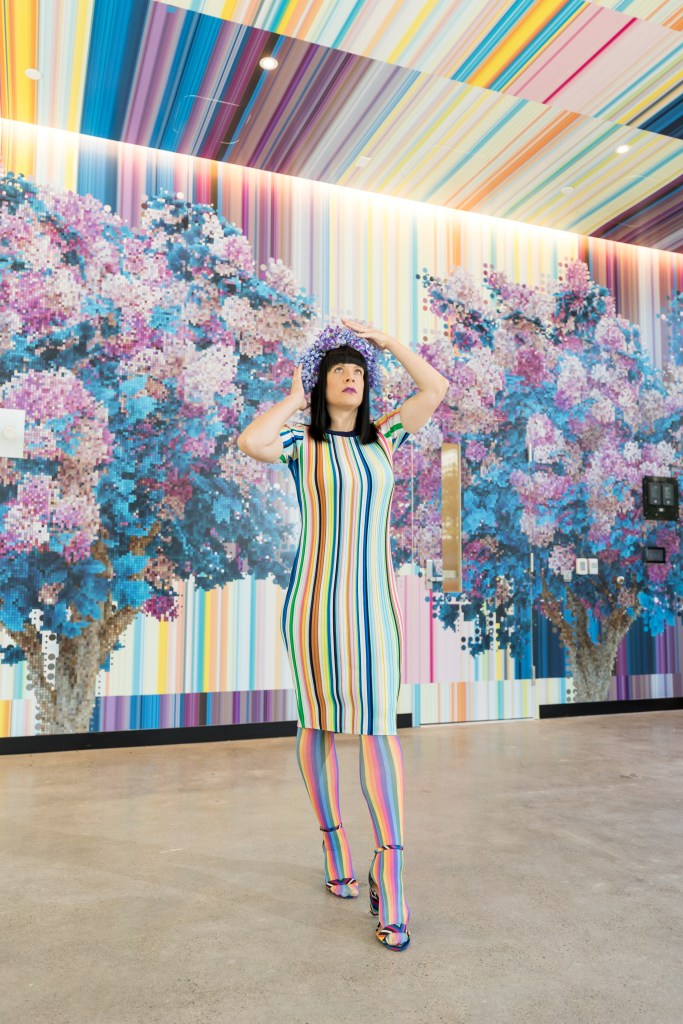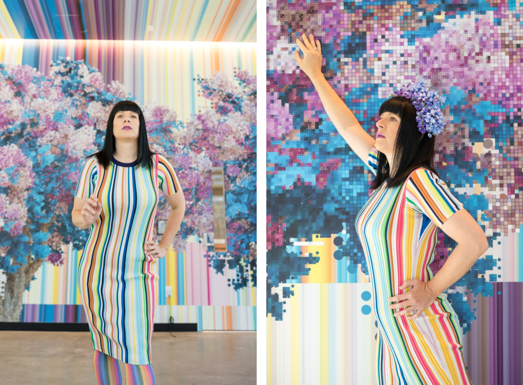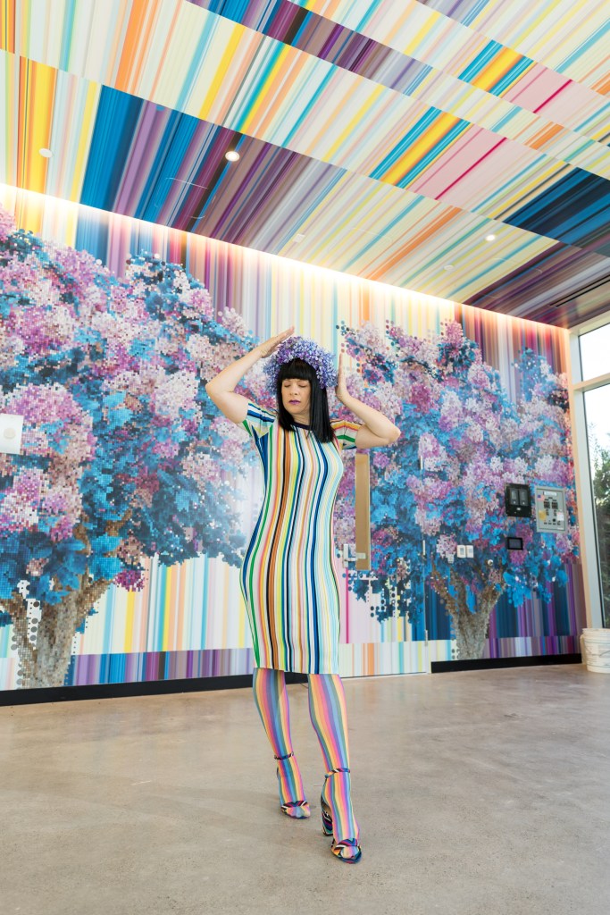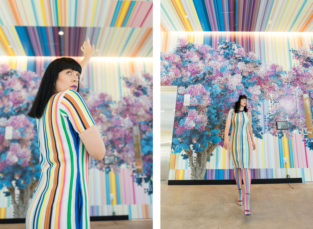 The RaDDness continues here on the blog with my third post featuring the new RaDD Artwalk near the San Diego Waterfront. My first 2 features were sculpture works, but for my third blog feature of this collection I chose a mural work. This spectacular mural piece is called Purple Haze by artist Elena Manferdini. Everyone knows how much I love murals and this one really caught my eye because its not relegated to just a wall. Something about how it extends onto the ceiling really takes this to an immersive level. Purple Haze is inspired by the jacaranda tree…a tree know for its seasonal bright purple flowers. This tree is not native to San Diego, but is so prevalent that I have often thought of it as the un-official tree of San Diego. I have always loved these trees so I jumped at the chance to create a look not just inspired by art but also inspired by a local touch of nature. I have to toot my own horn and say that this may be the best fashion match to an artwork of all time…and add the custom jacaranda headband I made and I am all too pleased with myself! I’m still energized by this plentiful public art experience!
