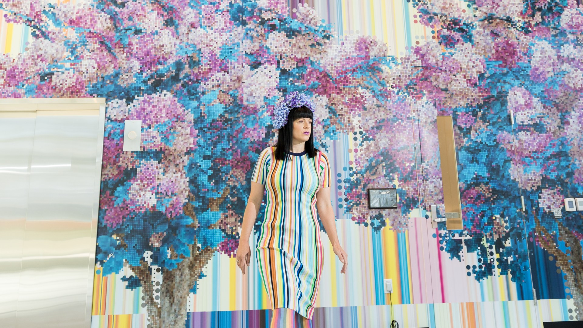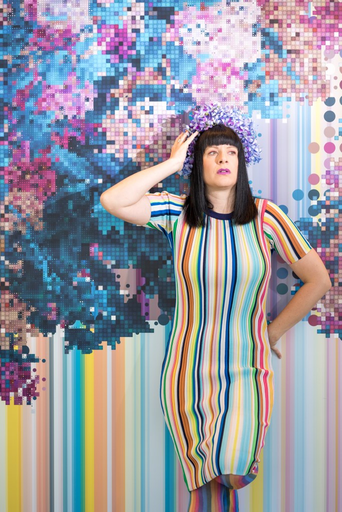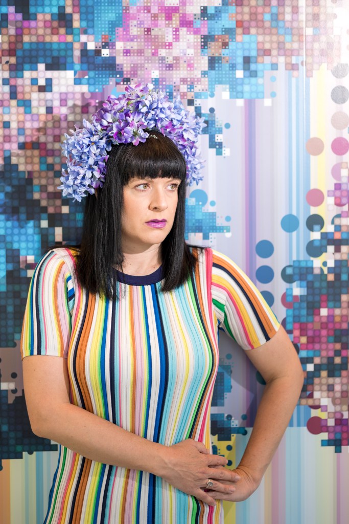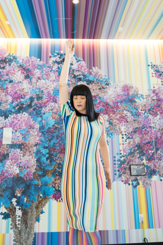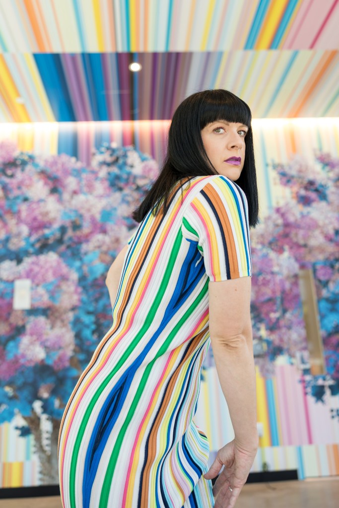 The RaDDness continues here on the blog with my third post featuring the new RaDD Artwalk near the San Diego Waterfront. My first 2 features were sculpture works, but for my third blog feature of this collection I chose a mural work. This spectacular mural piece is called Purple Haze by artist Elena Manferdini. Everyone knows how much I love murals and this one really caught my eye because its not relegated to just a wall. Something about how it extends onto the ceiling really takes this to an immersive level. Purple Haze is inspired by the jacaranda tree…a tree know for its seasonal bright purple flowers. This tree is not native to San Diego, but is so prevalent that I have often thought of it as the un-official tree of San Diego. I have always loved these trees so I jumped at the chance to create a look not just inspired by art but also inspired by a local touch of nature. I have to toot my own horn and say that this may be the best fashion match to an artwork of all time…and add the custom jacaranda headband I made and I am all too pleased with myself! I’m still energized by this plentiful public art experience!