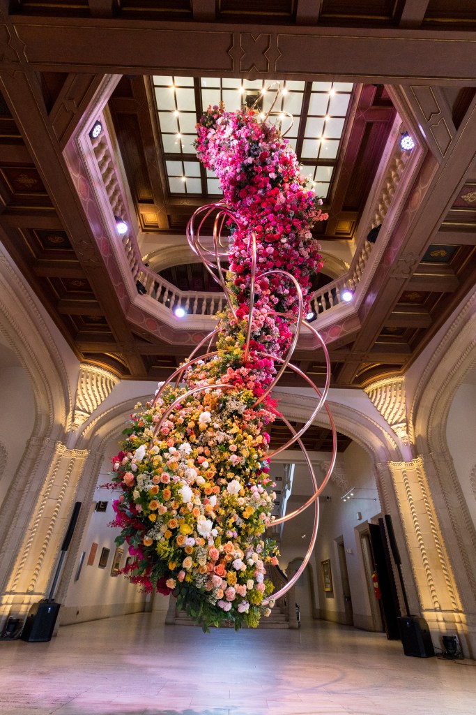 Before and after this sit down meal, we reveled in the ambience of captivating 40 foot rotating floral installation by returning return designer team Natasha Lisitsa Daniel Schultz of Waterlily Pond. Magic was all around!