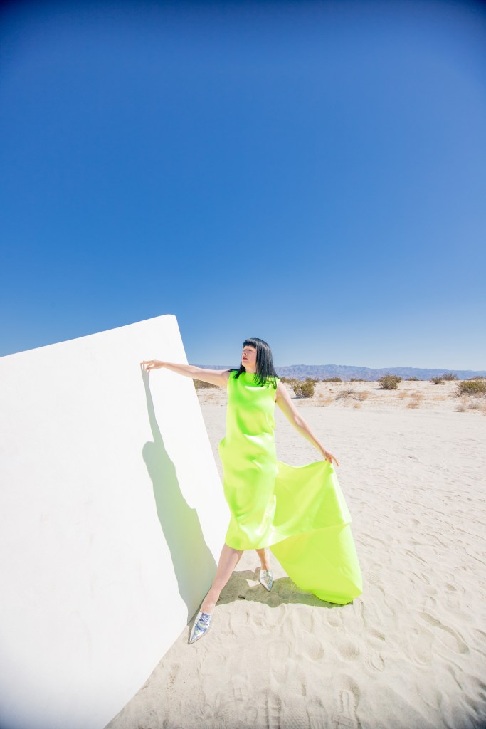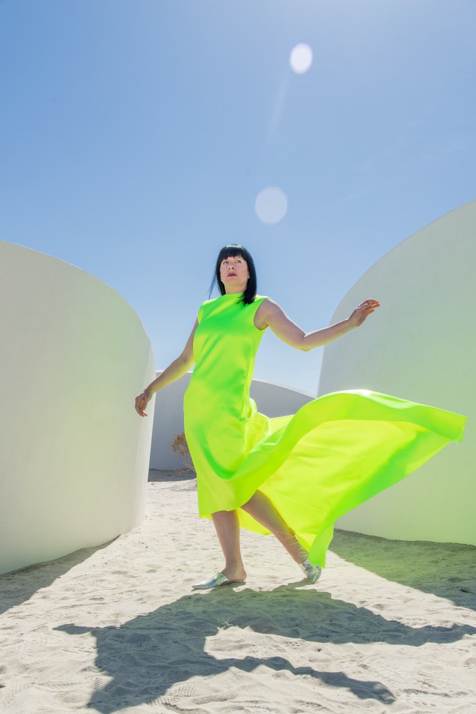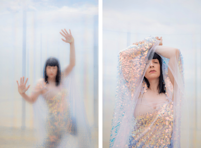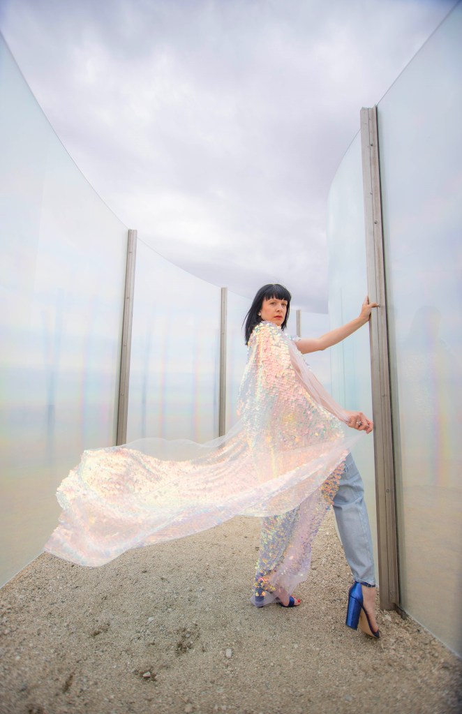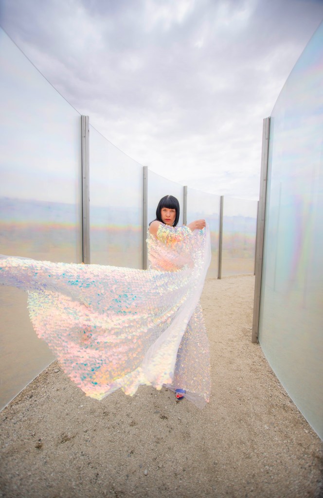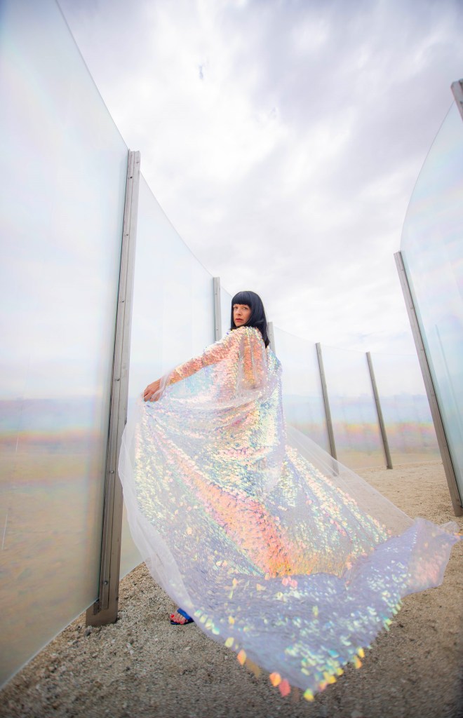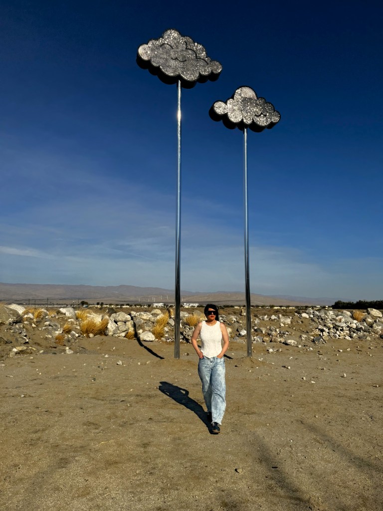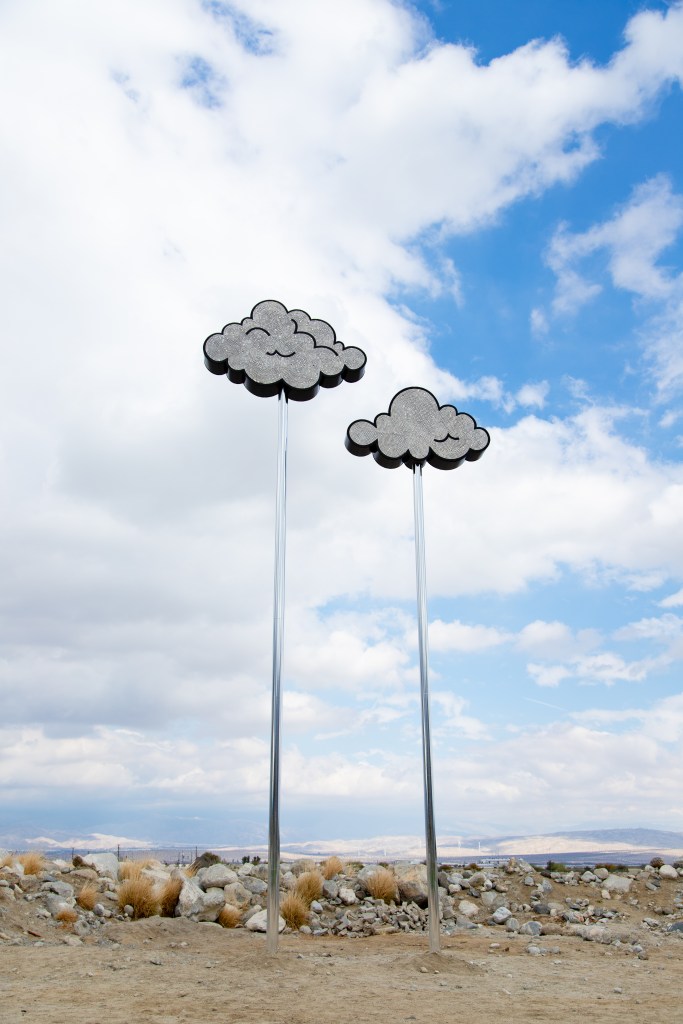 Unsui features two cloud shaped towering sculptures covered in sequins that glisten in the open desert sky. Inspired by the Buddhist idea of “unsui,” which means “clouds and water,” the piece explores themes of freedom, flow, and connection. Their shimmering forms are both otherworldly and deeply grounded. Unsui is both playful and profound and the way the sculptures catch the light makes them feel alive.