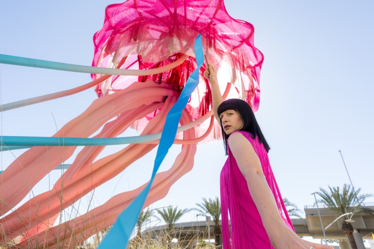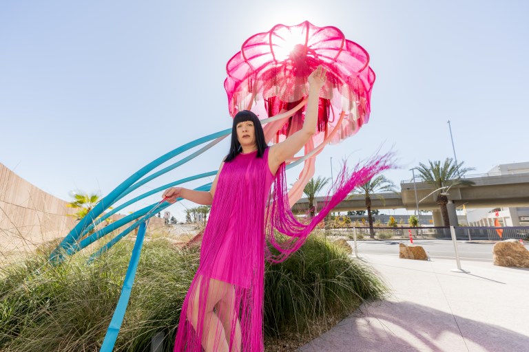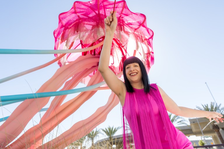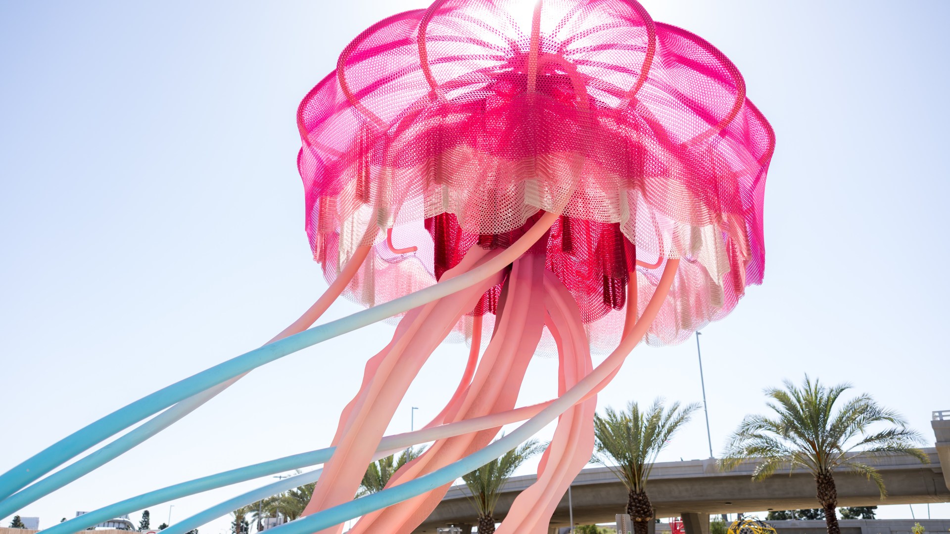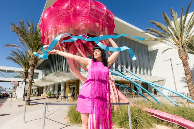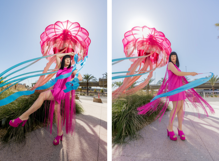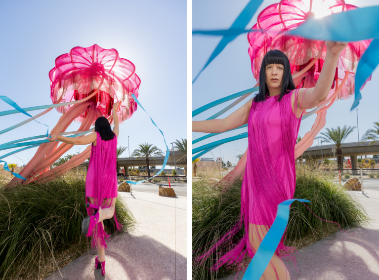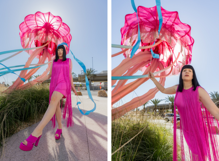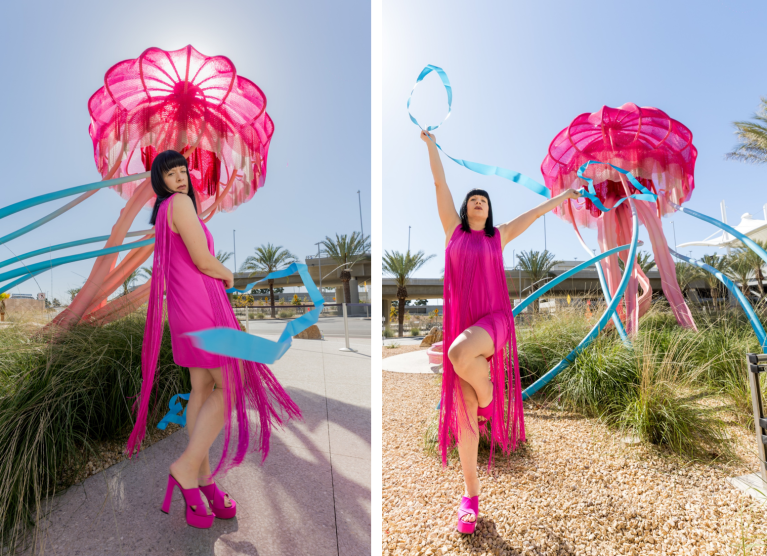 At San Diego International Airport’s newly opened Terminal 1, the piece “RISE” by Matthew Mazzotta floats above the main plaza in a luminous canopy, inspired by the purple-striped jellyfish native to our coastline. The layered rings shimmer and shift in the coastal light, hovering somewhere between sculpture and atmosphere. I wore a pink fringe dress that mirrored the sculpture’s soft cascading form and danced with long blue streamers meant to echo both the tentacle-like structure and the natural movement of water. The fringe caught the air the way the installation catches light; the streamers traced fluid lines against the sky. It became less about posing and more about motion. This shoot was also about celebrating new development in San Diego that makes room for more art to be shown, woven directly into the fabric of the city rather than placed on its margins…reminder that growth and creativity can rise together.